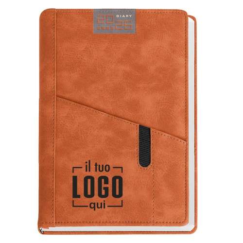 Agenda 352 pagine in confezione regalo con penna, tasca interna, chiusura con elastico, pagine removibili. Personalizzabile con logo. Ideale per omaggi aziendali.