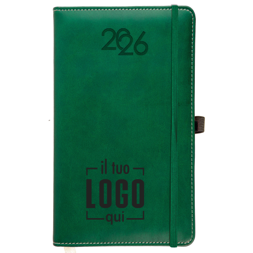 Agenda tascabile settimanale 2026, copertina rigida in PU termovirante con impuntura perimetrale. Con elastico per la chiusura e anello porta penna. 12 mesi. 64 pagine in carta bianca da 70 g/m2. Copertina personalizzabile.