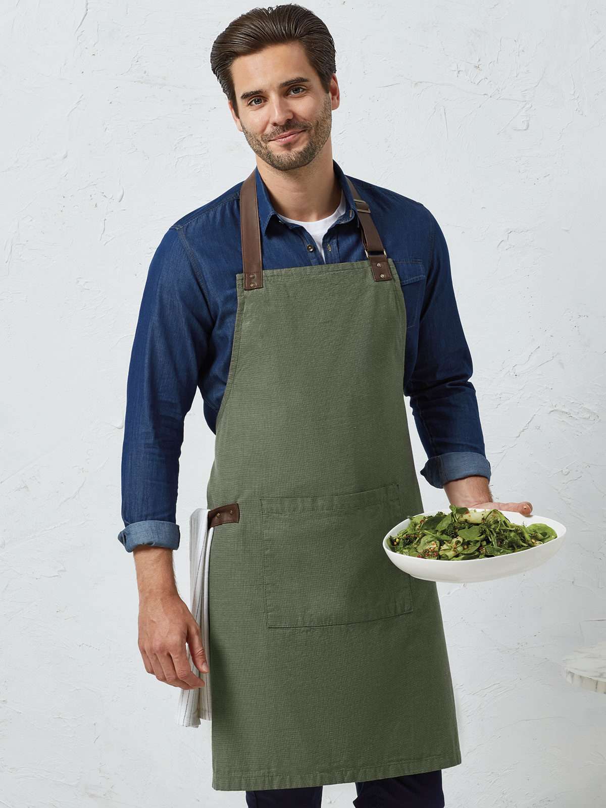 100% cotone Oxford effetto filato. Grembiule con inserti in finta pelle. Girocollo in ecopelle con fibbia regolabile e cuciture a contrasto, asola appendi-grembiule e linguette laterali in ecopelle con cuciture a contrasto, tasca centrale, doppio occhiello per la chiusura in vita.