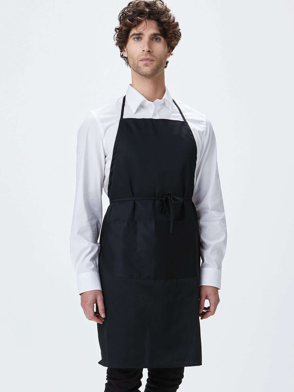 80% poliestere, 20% cotone. Grembiule con pettorina con laccio scorrevole, ampia tasca centrale con tre compartimenti separati. Lavabile a 40°C.