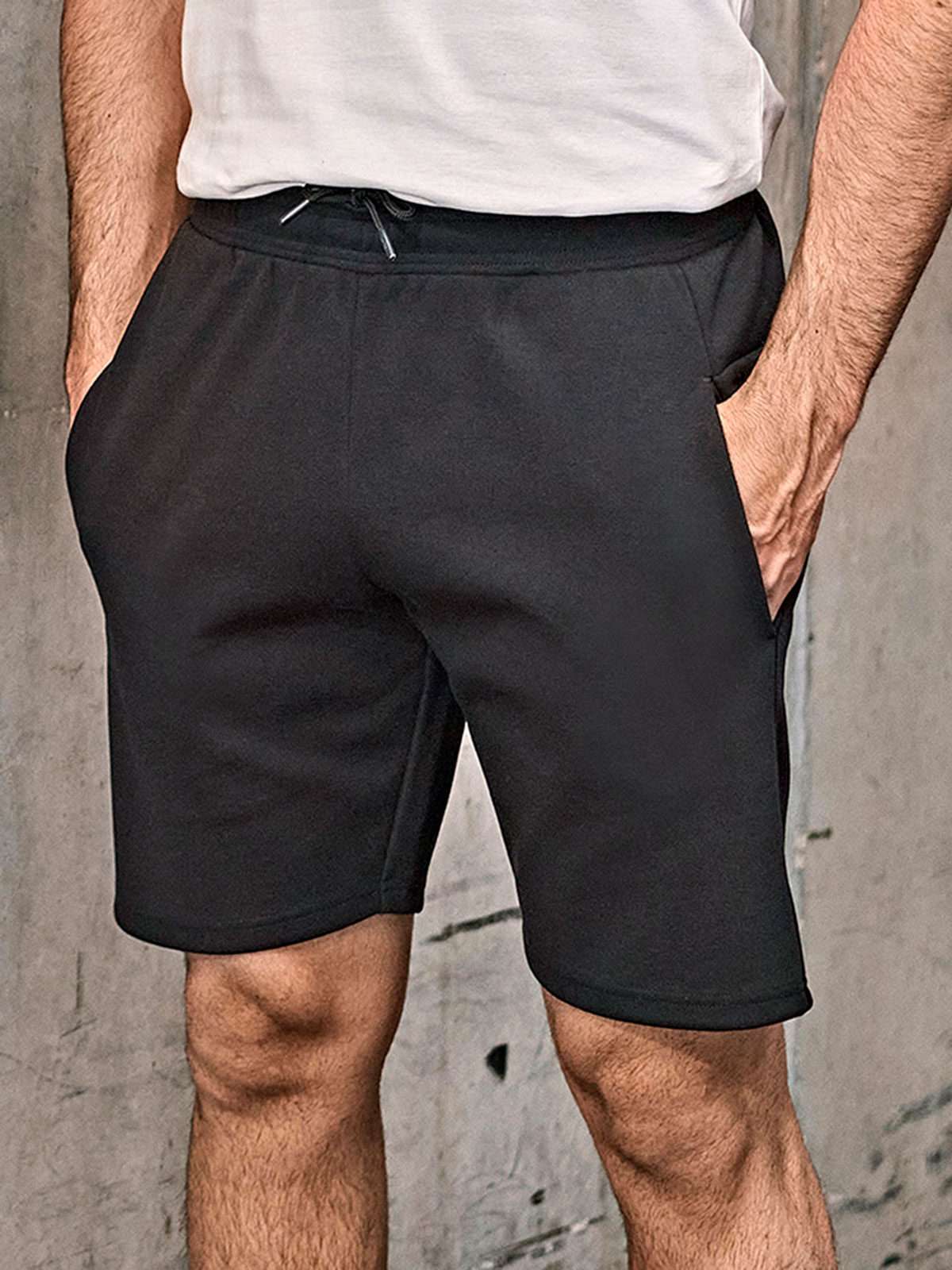 60% cotone 40% poliestere. Pantaloni corti sportivi in interlock, con elastico e coulisse in vita, due tasche frontali aperte, zip posteriore con cerniera con cordoncino.