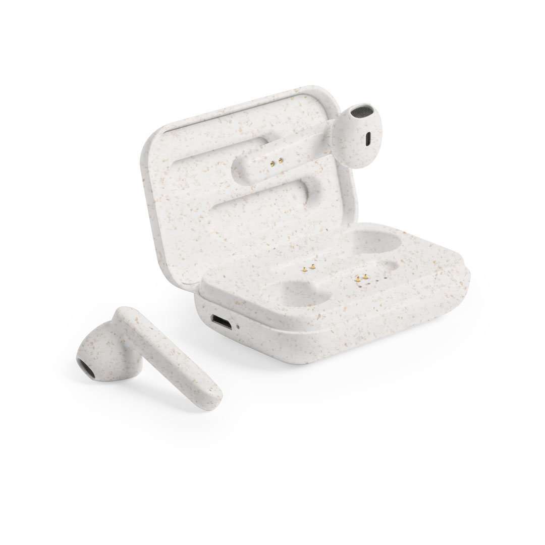 Cuffie intrauricolari della linea Nature. Connessione Bluetooth® 5.0 e rivestimento in canna di frumento, per favorire l'utilizzo di materie prime naturali e ridurre le emissioni inquinanti. Progettati ergonomicamente, includono un pulsante di controllo touch integrato nell'auricolare, con una base di ricarica abbinata e una spia di stato di ricarica a LED. Funzione vivavoce e ricaricabile, con cavo micro USB incluso. Presentato in una lussuosa valigetta individuale con coperchio incernierato e un'attraente scatola dal design ecologico.
