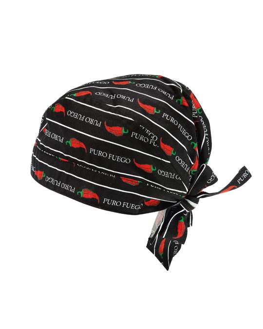 10M443 Bandana con fascia tergisudore ed allacciatura posteriore, realizzata in 100% cotone 168 g / m², proposta nella stampa Peperoncino e Menu nero. Si abbina perfettamente con il pantalone Atene.