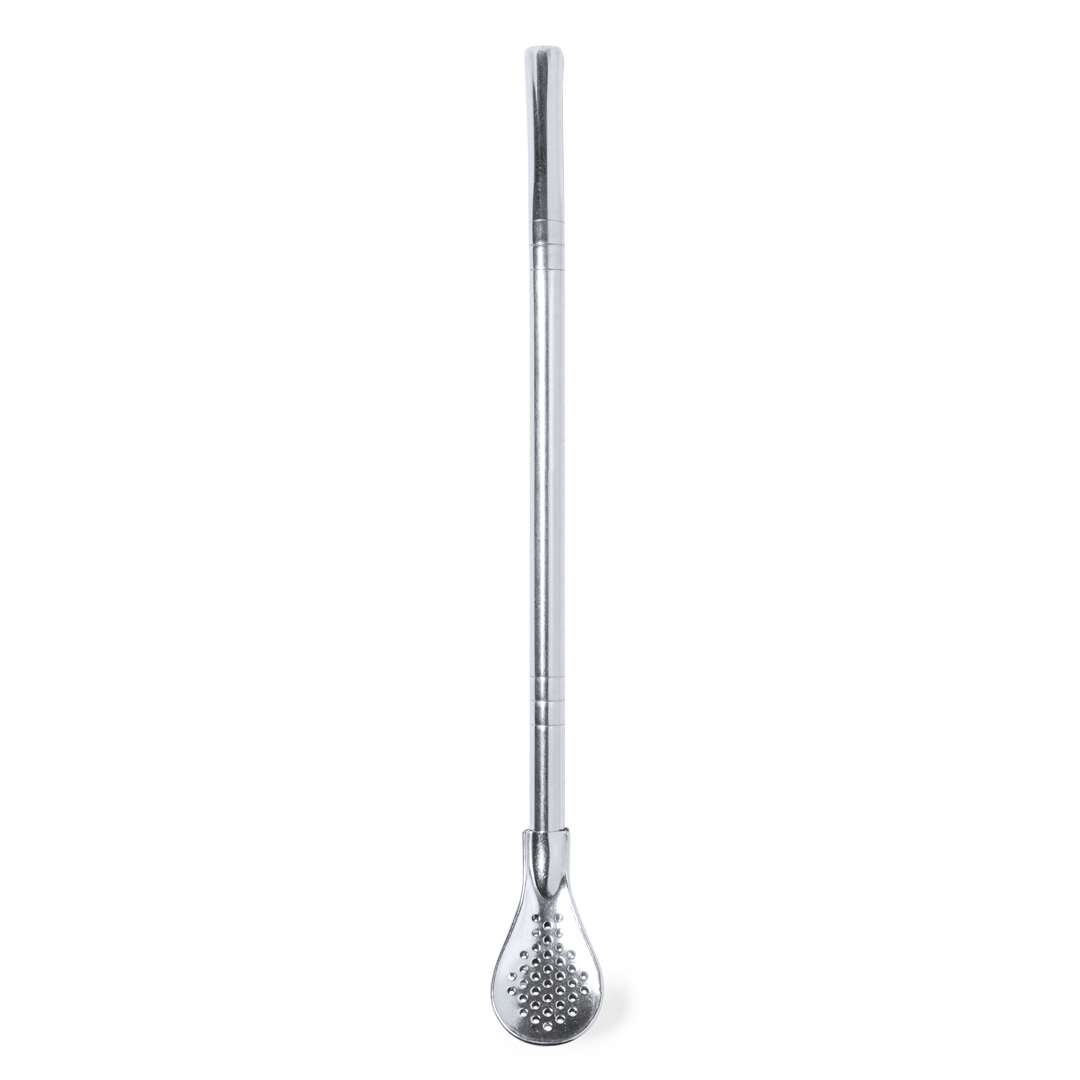 Pratico agitatore in acciaio inox con cannuccia. Dal design elegante e funzionale, questo accessorio è indispensabile per le bevande calde o fredde. Cannuccia integrata per bere facilmente e pratico cucchiaio con filtro all'estremità inferiore. Presentato in un sacchetto individuale.