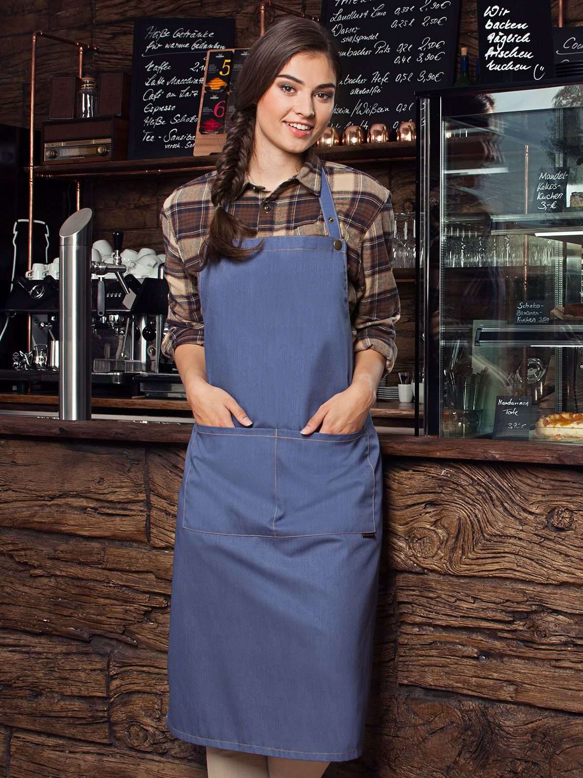 65% poliestere, 35% cotone. Grembiule di jeans con pettorina, doppie cuciture, cuciture in contrasto, cordino al collo regolabile con tre bottoni, tasca frontale (40 x 20 cm) con due comodi compartimenti (20 x 20 cm). Adatto al lavaggio industriale. Cordini in vita 112 cm l'uno.