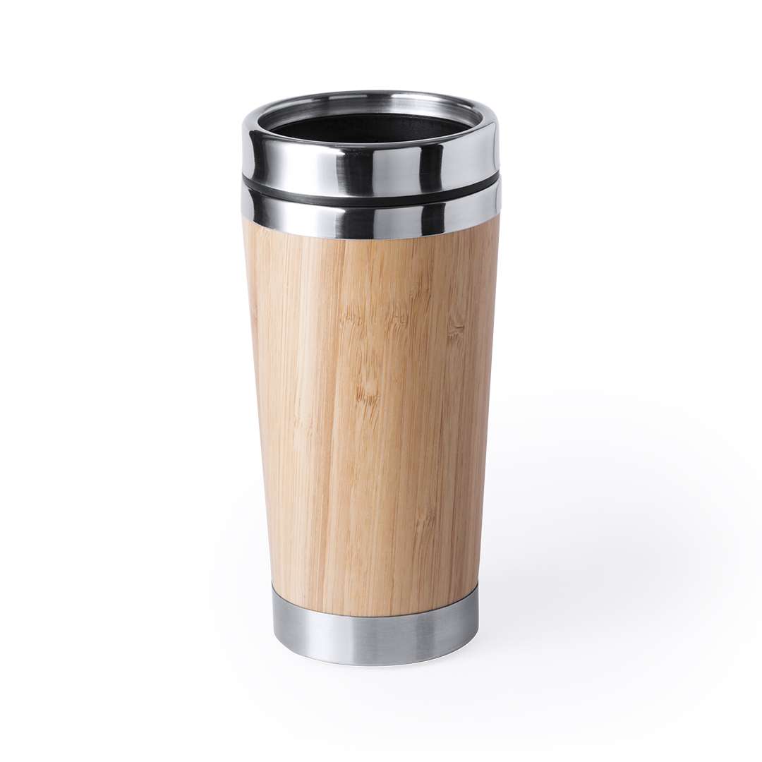Bicchiere da tavolo da 500 ml con interno in acciaio inox ed esterno in legno di bambù. Con coperchio dosatore di sicurezza e apertura facilitata. Confezionato singolarmente in una scatola dal design accattivante.