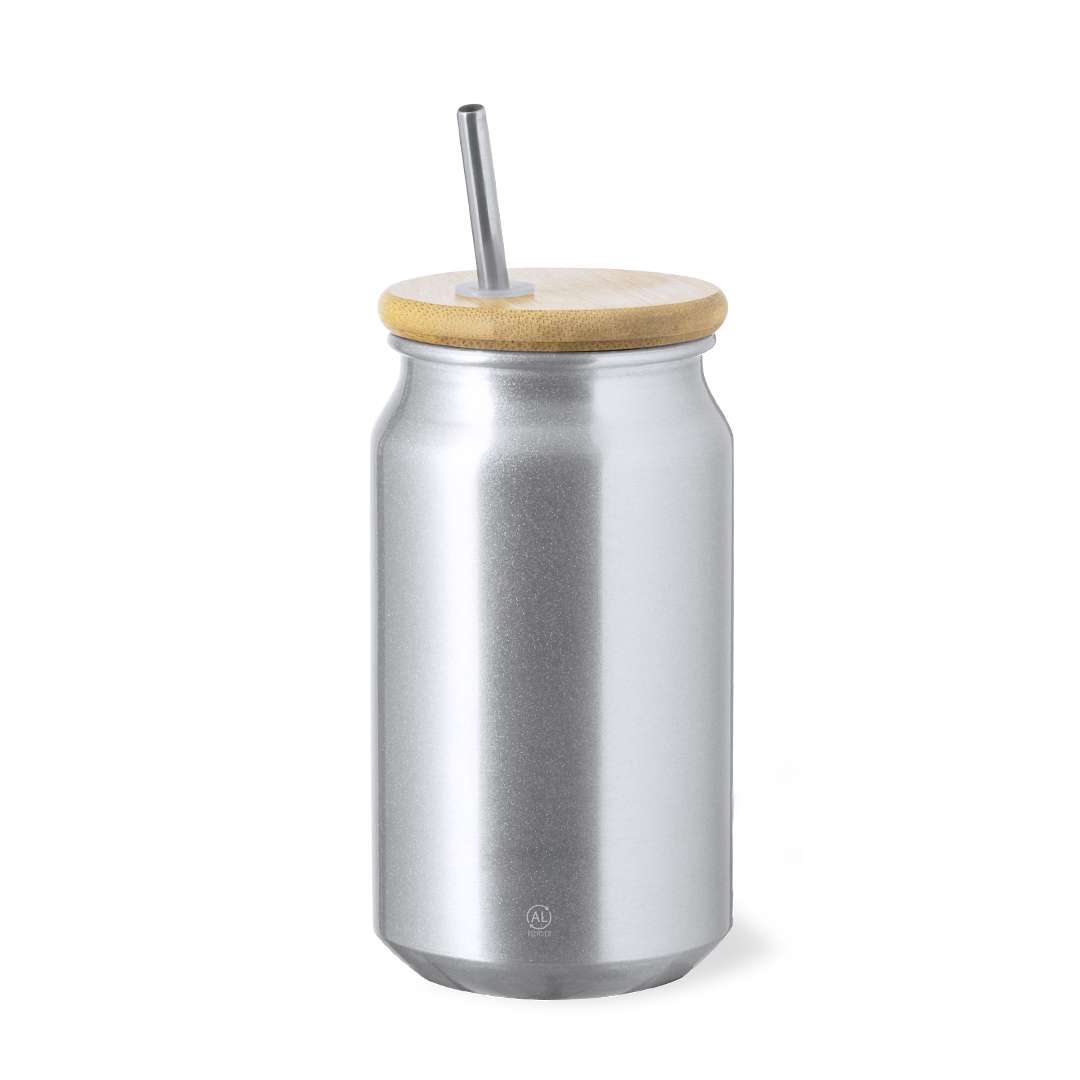 Bicchiere con capacità di 430 ml. Realizzato in alluminio riciclato elegante e sostenibile. Con tappo a scatto in bambù, foro per la cannuccia e cannuccia riutilizzabile in acciaio inox. Con logo alluminio riciclato. Confezionato singolarmente in una scatola kraft di design e in un sacchetto riciclato.