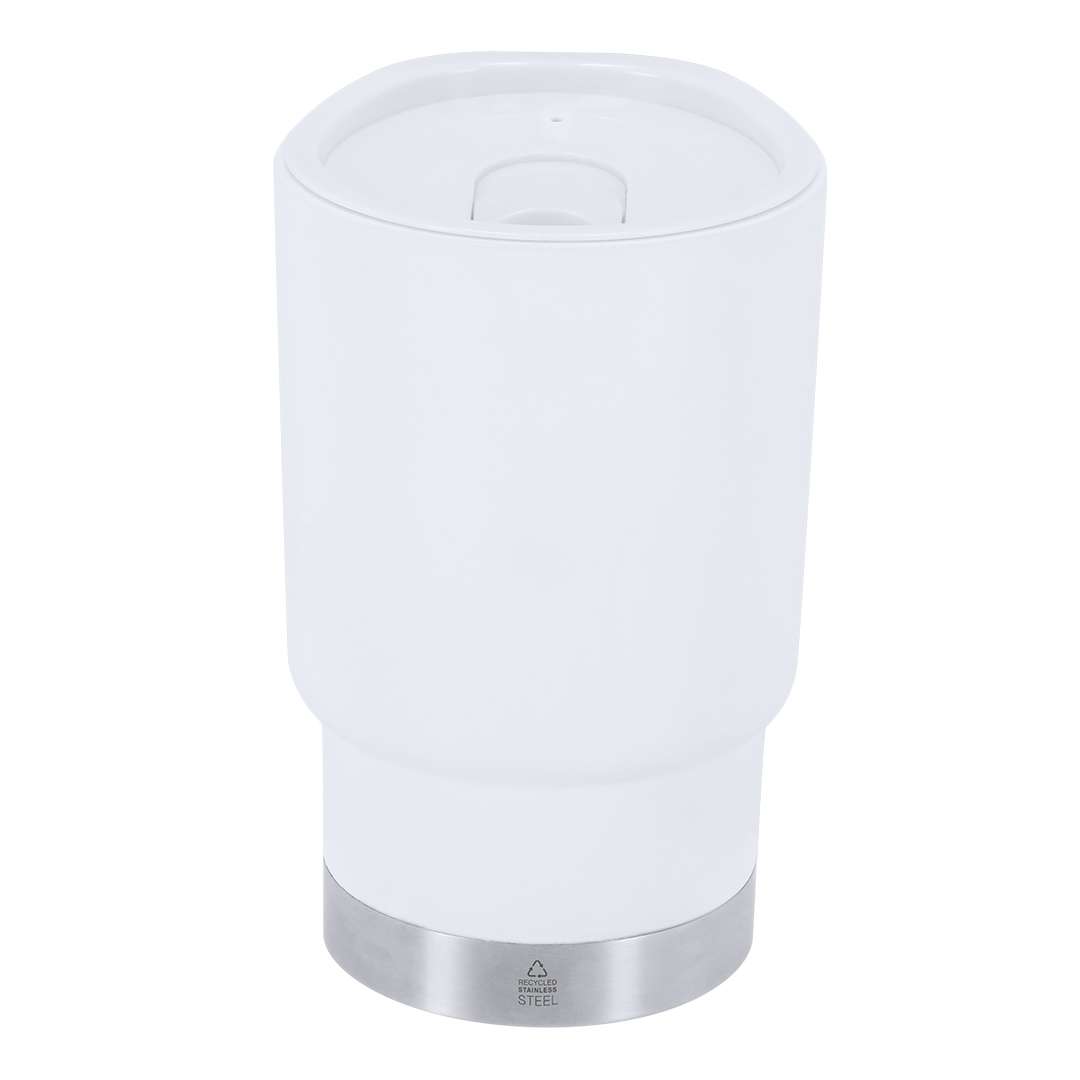 Bicchiere termico da 380 ml. Realizzato in resistente PP Riciclato a doppia parete, in combinazione con base in Acciaio Inox Riciclato. Coperchio con dosatore ad apertura facile, privo di BPA. Perfetto per la scrivania, il tavolo o qualsiasi superficie dove godersi comodamente la propria bevanda preferita. Con certificazione Food Grade, che garantisce la sicurezza a contatto con gli alimenti. Con distintivo in Acciaio Inox Riciclato. Il PP Riciclato è una plastica riciclata e altamente riciclabile, molto resistente e adatta a molteplici applicazioni. Lacciaio è uno dei materiali più richiesti e si trova praticamente ovunque, dai prodotti di uso quotidiano alle grandi costruzioni. Con innumerevoli proprietà, tra cui spiccano la durabilità e lalto grado di riutilizzo, rappresenta unalternativa molto apprezzata nelle soluzioni di sostenibilità. Adeguatamente trattato, consente di ottenere nuove risorse di utilizzo infinito.