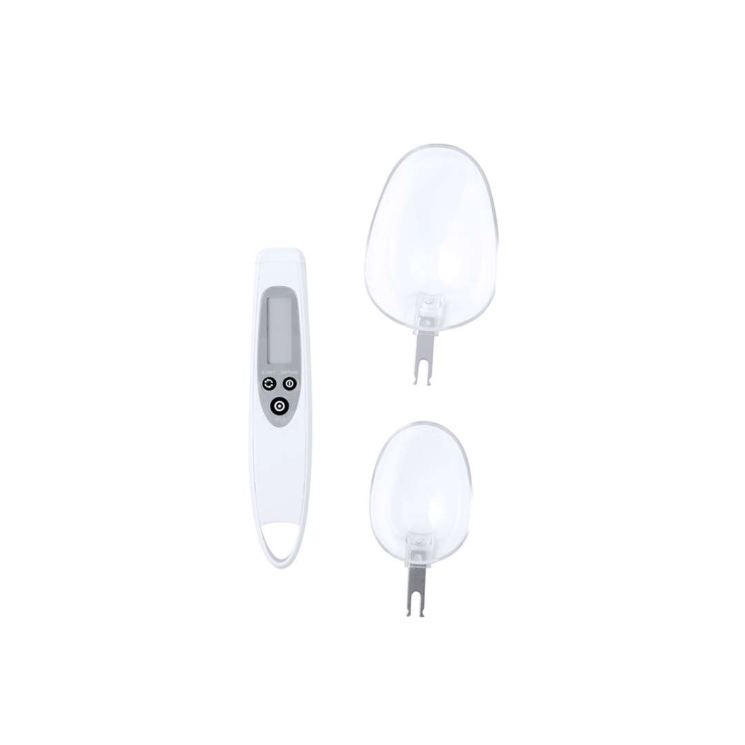 Pratica bilancia digitale con cucchiaio, valida per liquidi e solidi. Include 2 cucchiai intercambiabili e uno schermo digitale LCD situato sul manico, che mostra la pesatura con una precisione di 0,1 g. Pulsante per visualizzare il peso in grammi (g), once (oz), o millilitri (ml), con funzione di memoria e possibilità di pesare due ingredienti. Su entrambi i cucchiai è incisa un'ulteriore scala di misurazione per i liquidi: il cucchiaino da 5 ml a 25 ml; e il cucchiaio grande da 10 ml a 50 ml. Con manuale di istruzioni in spagnolo e inglese. Alimentato da batteria a bottone (inclusa) e presentato singolarmente in una scatola dal design kraft.