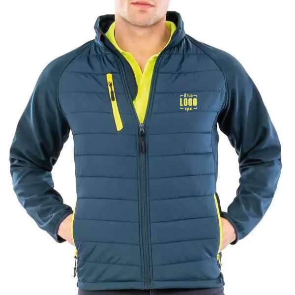 100% poliestere riciclato TOPGREEN. Softshell impermeabile, tasche con cerniera in contrasto, frontale YKK con protezione per il mento, collo e busto imbottiti, fodera REPREVE, polsini morbidi, tiralampo nero, maniche stampabili, etichetta strappabile.