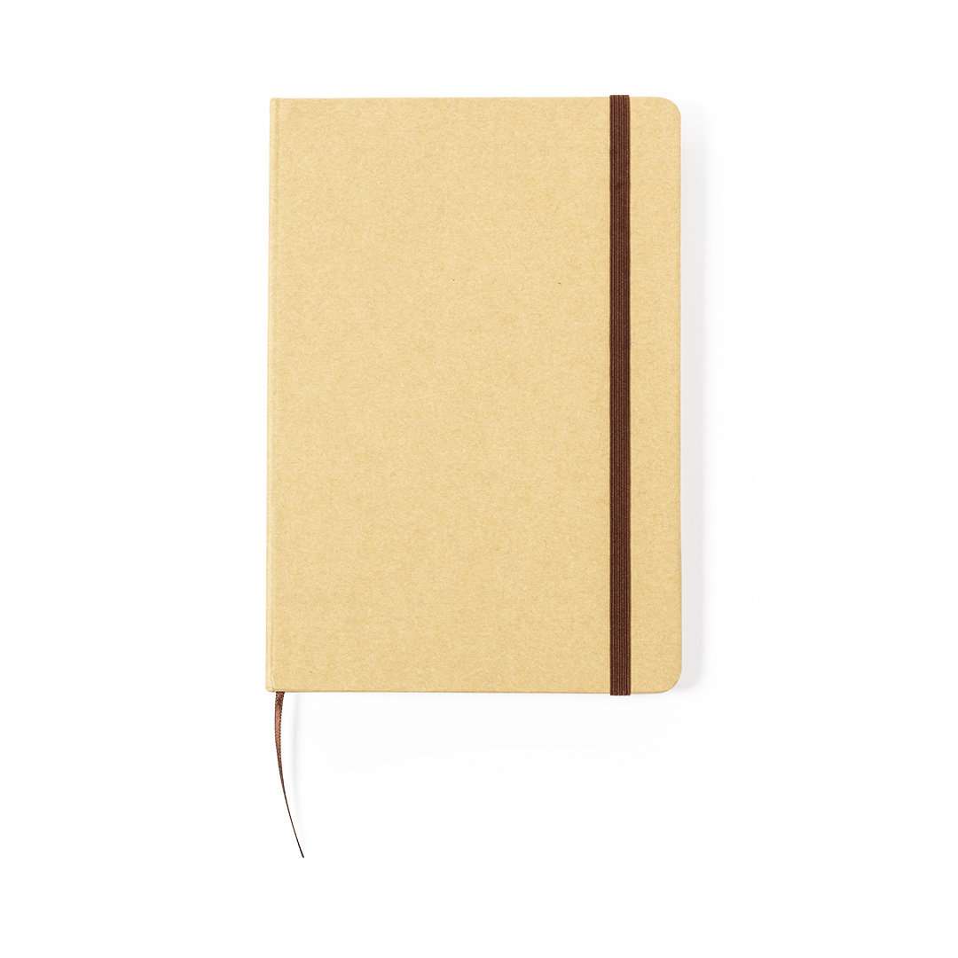 Block Note - formato A5 - della linea natura con copertina rigida in robusto cartone riciclato. 100 fogli lisci con rifinitura kraft, etichetta riciclata, con rilegatura elastica e segnalibro in tessuto abbinato.