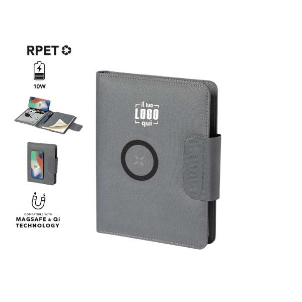 Cartella/block notes multifunzionale in poliestere 300D RPET, realizzato con plastica riciclata, per promuovere il riutilizzo dei rifiuti plastici e contribuire alla sostenibilità del pianeta. Con chiusura magnetica ed etichetta RPET allinterno. Caricatore wireless da 10W integrato nella copertina, con chiusura magnetica per utilizzare il dispositivo durante la ricarica e anello adesivo incluso, compatibile con tutti i dispositivi con tecnologia Magsafe e Qi.Batteria integrata con capacità di carica di 5.000 mAh, con porta di ingresso/uscita di tipo C e indicatore di stato di carica a LED, cavo incluso.Interno con supporto per smartphone e vari scomparti per carte, tra cui un portapenne e un blocco note A5 con 65 fogli con layout a righe. Presentato in una scatola dal design accattivante.