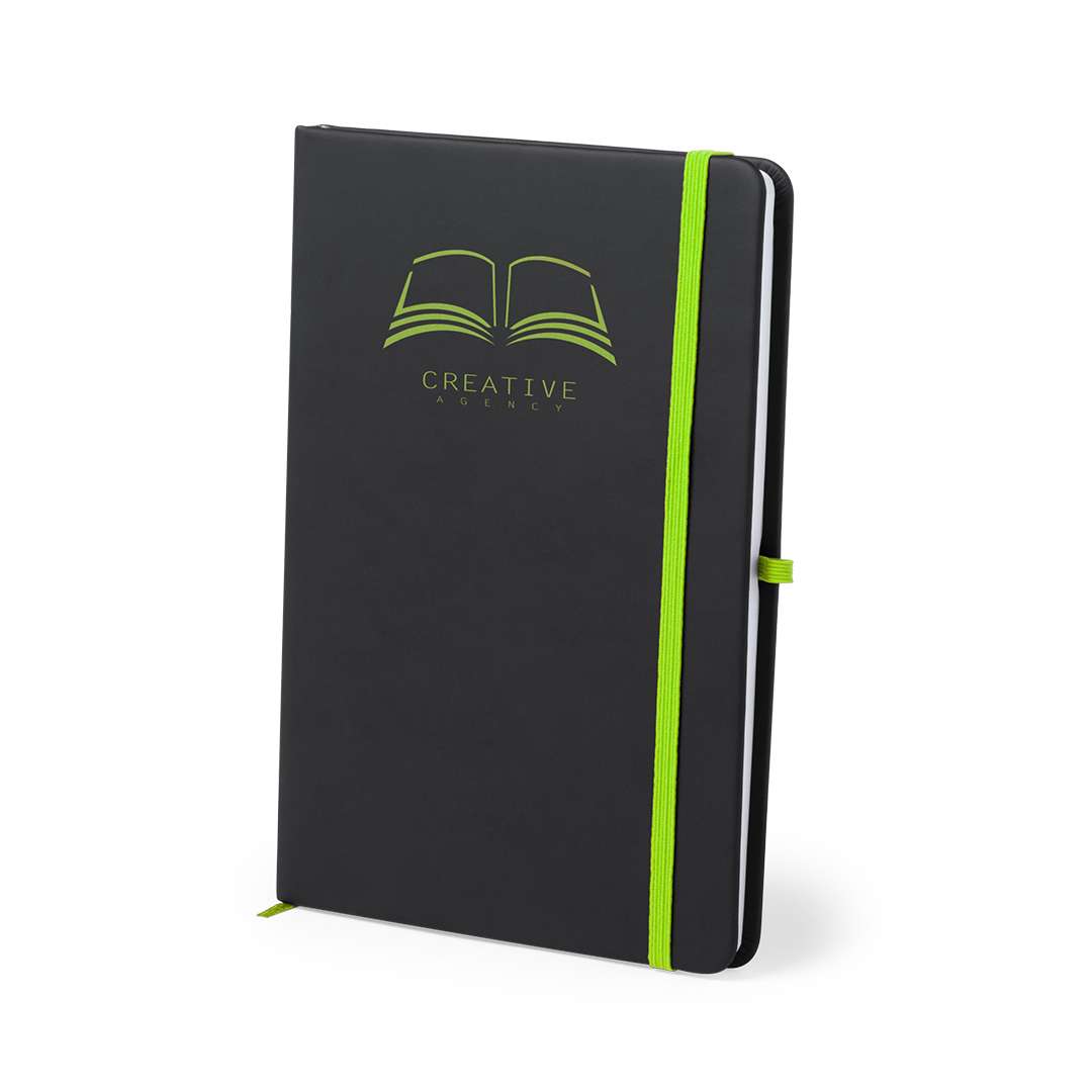 Block notes con copertina morbida al tatto e rifinita in similpelle. In elegante nero, con chiusura elastica, segnalibro e portapenne elastico in colori vivaci. Fodera esterna appositamente progettata per la stampa laser, in modo che la vostra pubblicità o il vostro marchio siano perfettamente incisi in un colore abbinato all'articolo. Include 100 fogli con layout a riga singola.