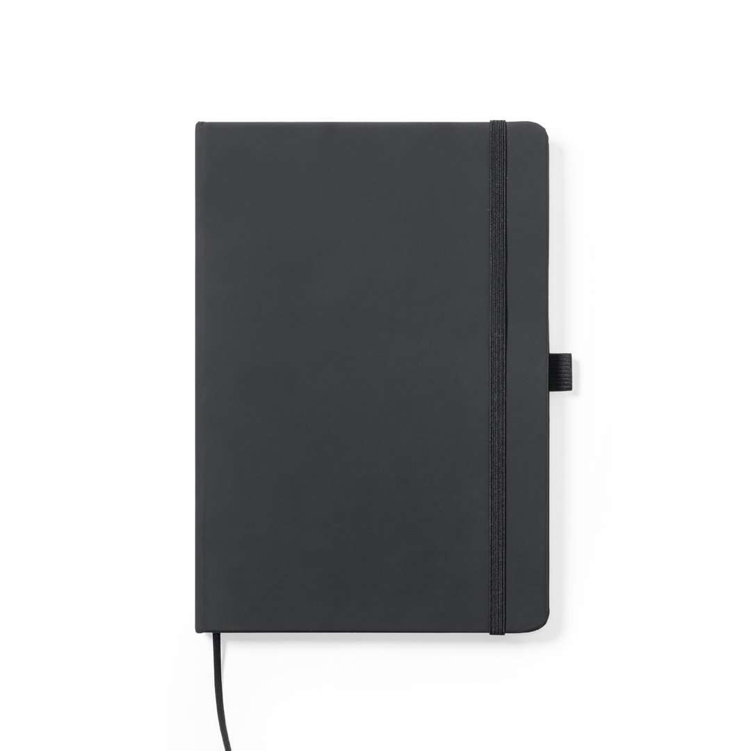 Block notes in finta pelle con elegante finitura nera. Con copertina rigida, segnalibro ed elastico coordinato. All'interno 100 fogli a riga singola e portapenne (penna non inclusa).