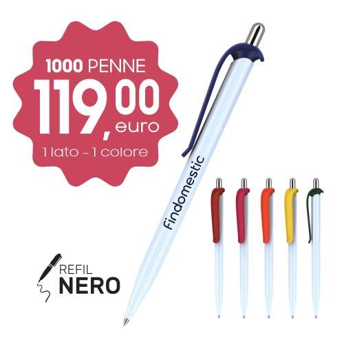 Promo imperdibile per aziende e rivenditori! Ordina 1000 penne a sfera in plastica modello Bollani con clip colorata in plastica e personalizzazione monocolore su 1 lato, al prezzo straordinario di 119 € IVA esclusa.