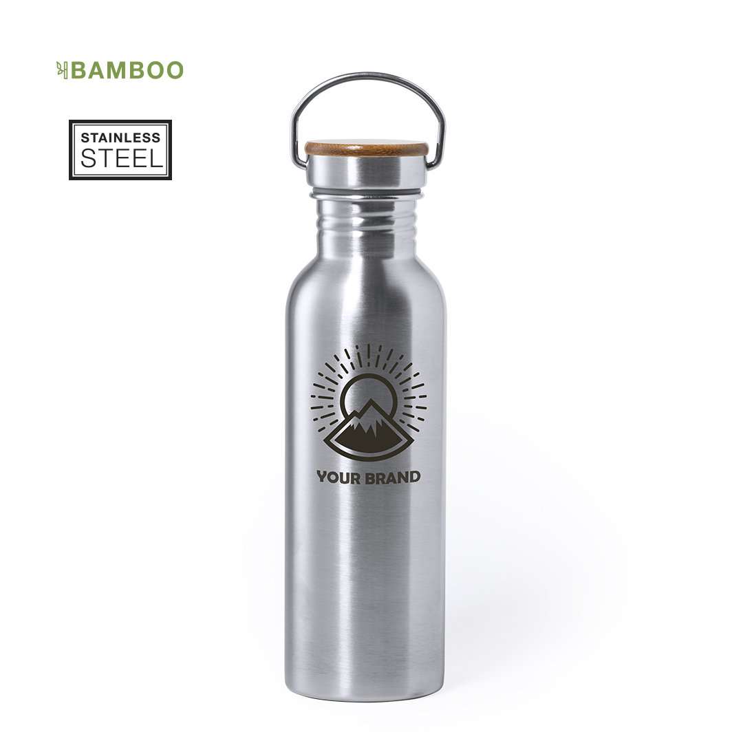 Borraccia 800ml in acciaio inox con tappo in bambù e maniglia in metallo. Confezione eco-design. Stile naturale ed elegante, perfetta per uso quotidiano.