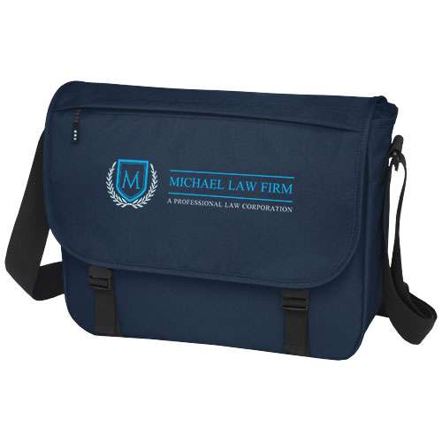 Borsa per computer portatile in PET riciclato sostenibile certificato GRS, realizzata con materiali riciclati al 60%. Ampio scomparto principale con cerniera, custodia imbottita per portatile da 15" e scomparto anteriore (entrambi con chiusure in velcro). Aletta di copertura, tasca a cerniera, chiusura a fibbia. Comoda tracolla imbottita e regolabile e barra telescopica per trolley sul retro.