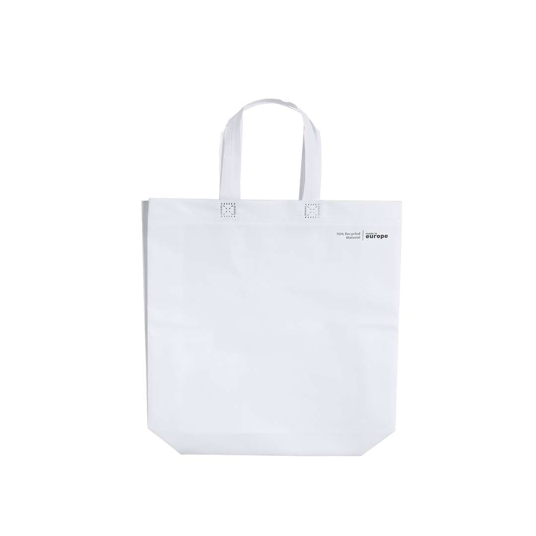 Borsa della linea Natuae, realizzata in TNT riciclato 120g/m2 laminato. Prodotta in Europa, con finitura termosaldata, soffietto, manici lunghi ed etichetta eco/made in sulla borsa.