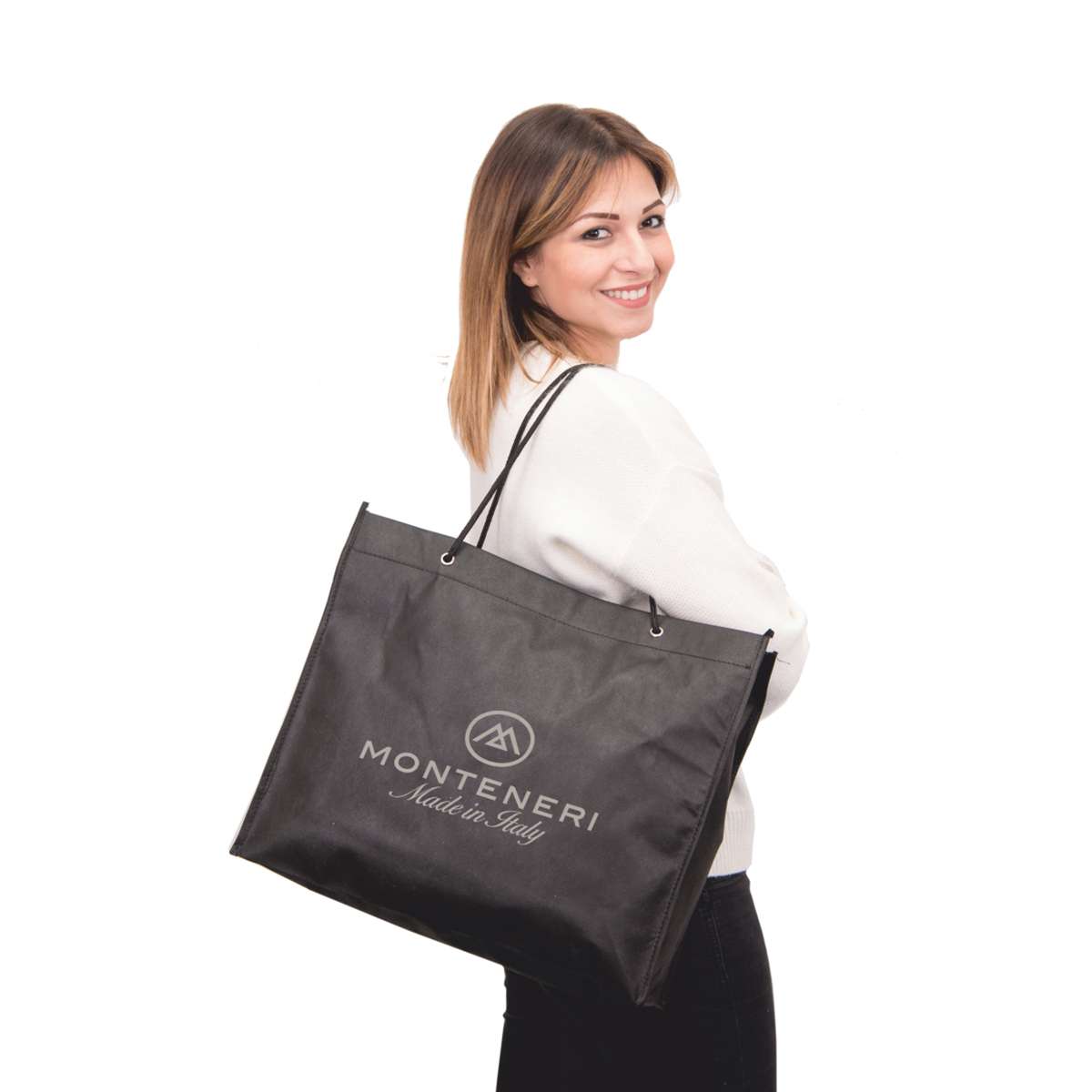 Shopper in Tnt 90 gr. manici in polyestere rinforzo in cartoncino e occhielli in acciaio inox manici lunghi