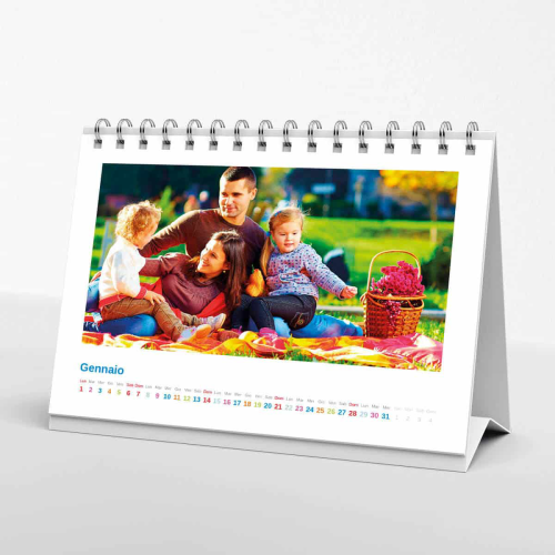 Grazie al pratico supporto pieghevole, questo calendario da tavolo è un compagno di lavoro indispensabile per tutto l’anno. Facile da aprire e da posizionare sulla scrivania, ti permette di tenere sempre sott’occhio impegni, scadenze e appuntamenti. Personalizzabile con il tuo logo aziendale, è anche un’idea regalo perfetta per clienti e collaboratori a inizio anno. Disponibile in diversi materiali – anche certificati FSC® e PEFC – con 13 o 14 fogli stampabili e spiralatura Wire-O in nero, bianco o argento.