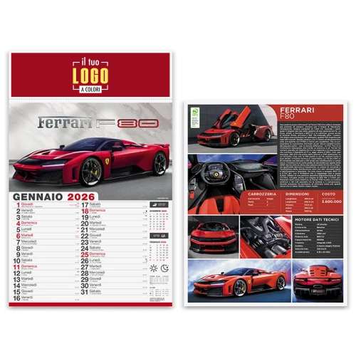 Calendario illustrato 2026 con 12 fogli in carta patinata 70g. Testata termosaldata 30×9 cm, retro a colori, con festività internazionali. Stampa personalizzabile.