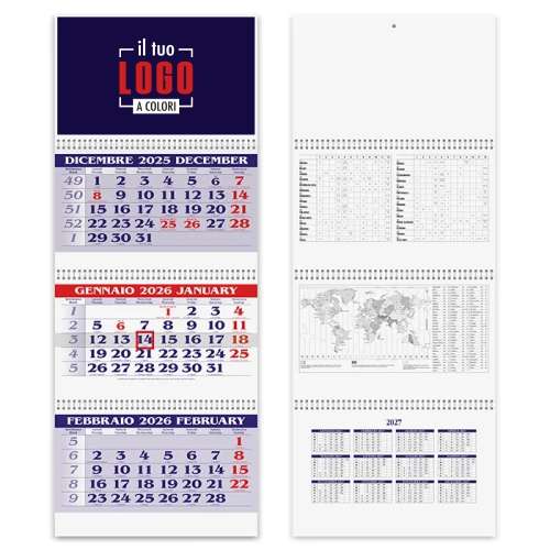 Calendario trittico composto da 3 blocchi da 12 fogli ciascuno, con spirali di rilegatura. Stampato su carta naturale 70 g/m², con testata e supporto in cartoncino lusso 600 g/m², che garantiscono robustezza e un aspetto elegante. Include notizie utili stampate direttamente sul supporto cartoncino e le festività internazionali. Completo di cursore montato per segnare facilmente la data corrente. Tecnica di stampa consigliata: digitale o serigrafica.
