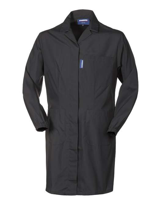Vestaglia da donna con chiusura centrale con bottoni coperti, collo aperto. Due tasche e un taschino applicati, schiena intera, martingala posteriore cucita, elastico ai polsi.