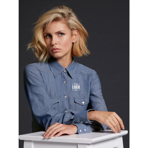 100% cotone pettinato. Camicia donna in tessuto denim, sprone classico sul retro, due taschine interne, impunture marcate, orlo arrotondato, Leggermente sfiancata ai lati.