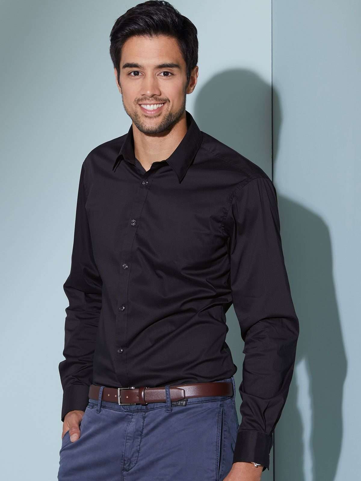 67% cotone, 30% poliammide, 3% elastane. Camicia e camicetta a manica lunga, taglio fashion, Tessuto poplin fine ed elastico, di facile stiratura con finissaggio easy-care, morbido e leggero sulla pelle, Colletto stretto e morbido, Taglio sciancrato, listarella bottoni alla francese, polsini regolabili.