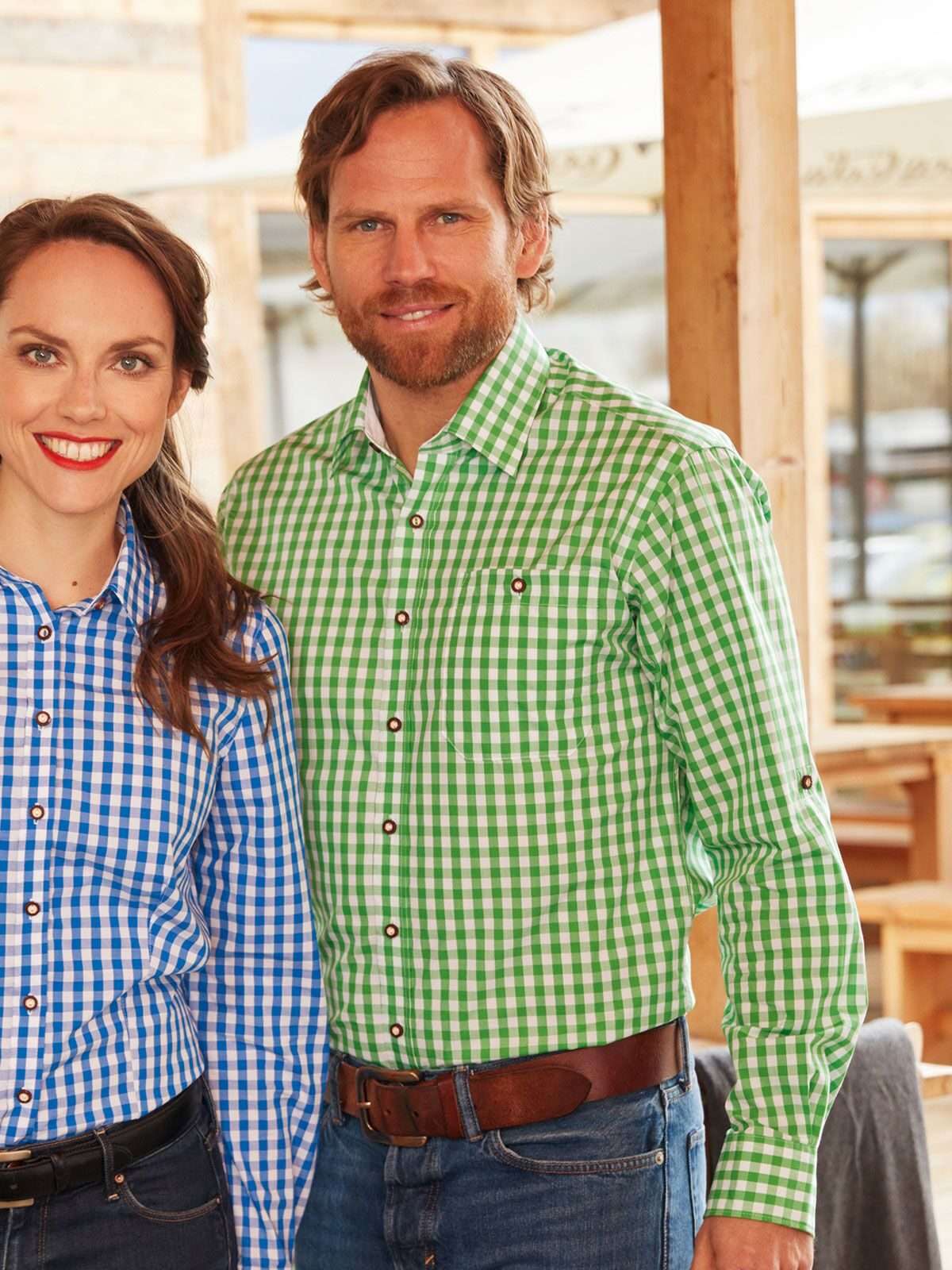 100% cotone. Camicetta donna e camicia uomo da classico costume tradizionale Pregiata qualità di popeline, facile da stirare con finitura easy-care, Manica rimboccabile con linguetta e bottone. Orlo arrotondato, Bottoni da costume tradizionale a imitazione del corno. Forma classica, leggermente sciancrata, tasca pettorale, 2 pieghe sulla schiena. Manica lunga, policromo, pence sulla schiena.