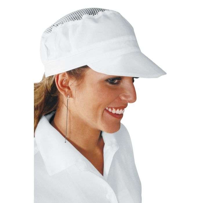 Il cappello Charly bianco con rete traspirante è un accessorio professionale pensato per il settore alimentare, alberghiero e della ristorazione. Pratico e comodo, è ideale per chi lavora in cucina, al banco o a contatto diretto con il pubblico. Dotato di visiera frontale, chiusura regolabile con velcro e pannelli in rete traspirante, assicura massima aerazione e comfort anche durante le giornate più intense. Un'ottima alternativa alla bustina o alla cuffia classica, mantiene un aspetto ordinato e professionale.