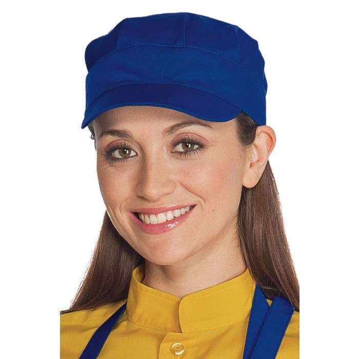 Cappello Sam blu cina. Ottima per il settore alberghiero e ristorazione. Divisa da lavoro per bar, pub, ristoranti, negozi alimentari, cucine e gelaterie. Regolabile con velcro e con visiera rigida, alternativa alla bustina o cuffia.