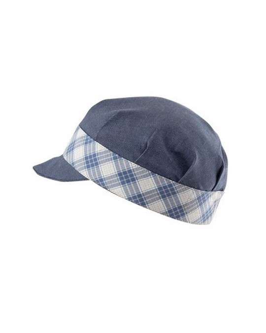 23P05I375 Tommy è un cappello con visiera, doppia fascia gironuca regolabile con velcro, calotta superiore con pieghe. Realizzato in 98% cotone e 2% elastan 200 g / m² nei colori Jeans blu e Tortora. Si abbina perfettamente con i grembiuli Douglas.