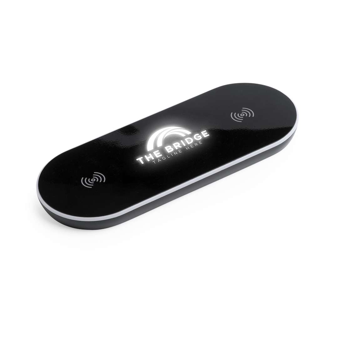 Caricatore wireless per la ricarica simultanea di un massimo di 2 dispositivi. In un elegante colore nero, con luce interna a led e un rivestimento esterno appositamente progettato per la stampa laser, grazie al quale la vostra pubblicità o il vostro marchio saranno illuminati con luce bianca. Base antiscivolo e compatibile con i dispositivi dotati di tecnologia di ricarica wireless. Presentato in un'attraente scatola di design. Cavo USB incluso.