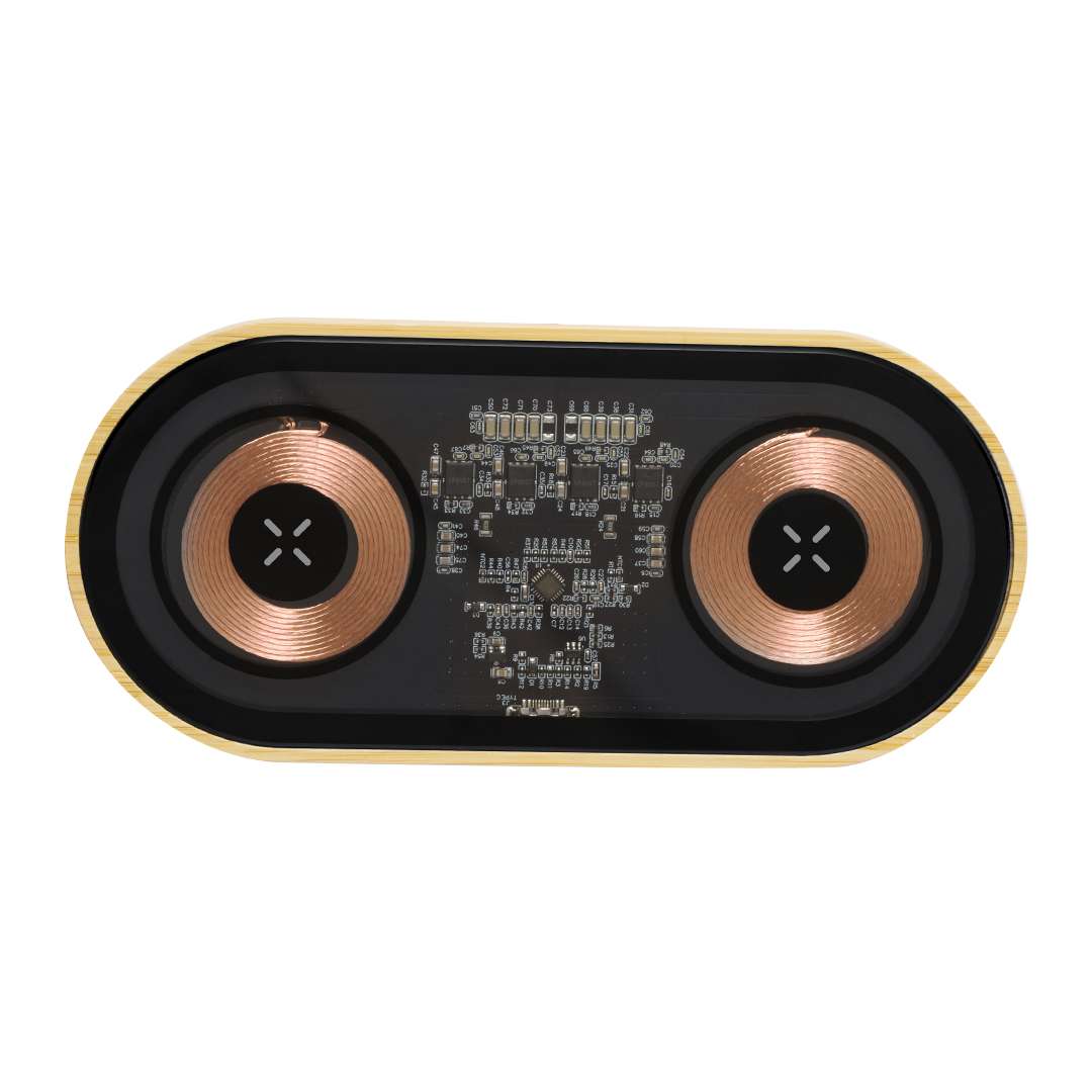 Dual 15W wireless charger in an original design with a transparent surface, showing the internal components of the device. With bamboo base, compatible with devices with Qi technology, and also enabling two devices to be charged at the same time. Type C connection, with instructions manual in English and Spanish. Presented in an individual box of kraft design.Materials such as bamboo encourage the use of natural raw materials, reducing pollutant emissions. It comes from a highly resistant and versatile plant with rapid growth and regeneration, making of it an excellent alternative to traditional wood.Manufactured according to RoHS standards and in compliance with the following safety requirements: Overheating protection system. Over-charge protection system. Blocking system to prevent short circuits.