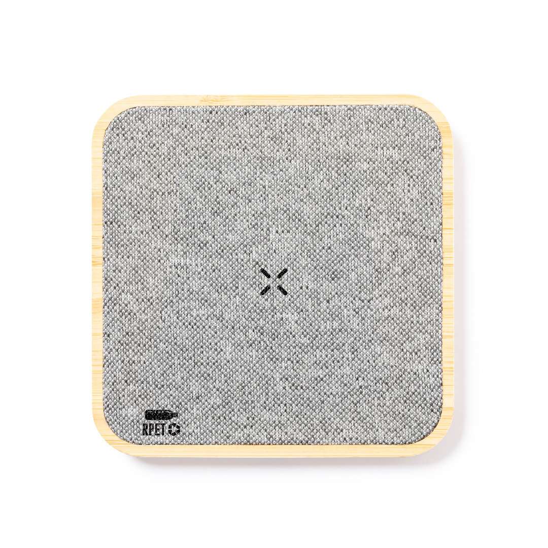 Caricatore wireless da 15 W con design rettangolare. Realizzato in bambù e poliestere RPET, ricavato da plastica riciclata, per promuovere il riutilizzo dei rifiuti plastici e contribuire alla sostenibilità del pianeta. Compatibile con i dispositivi dotati di tecnologia di ricarica wireless Qi. Include un cavo di ricarica di tipo C e un manuale di istruzioni in inglese e spagnolo. Con logo RPET e confezionato in una scatola kraft individuale.