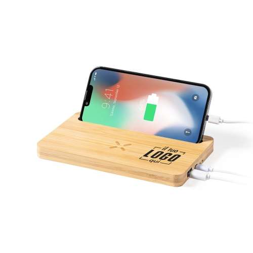 Organizzatore e caricatore wireless da 15 W della linea natura. Con funzione di supporto per smartphone e uscita USB da 2.000 mA. Carica contemporaneamente fino a 2 dispositivi (1 tramite ricarica wireless e 1 tramite cavo). Realizzato in bambù da tagli naturali e compatibile con i dispositivi dotati di tecnologia di ricarica wireless. Ampia area di branding e presentato in una scatola individuale di eco design in cartone kraft.