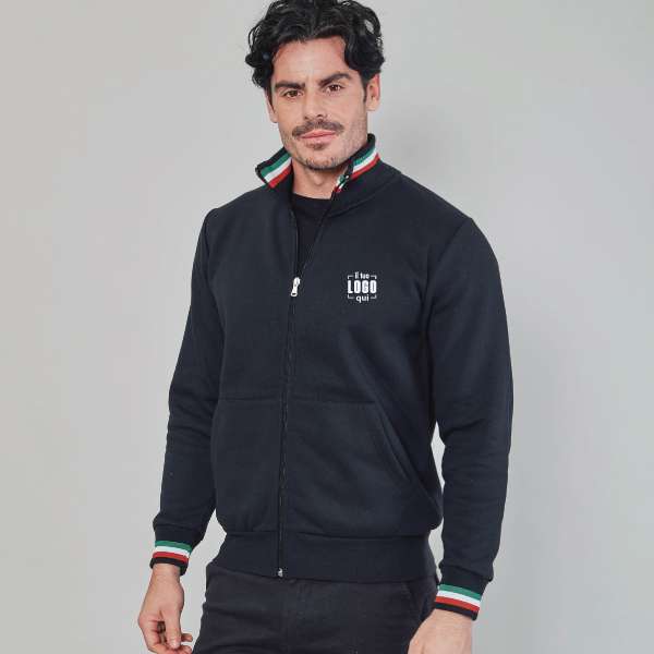 Felpa Uomo Ecologica in Cotone e Poliestere Riciclato Full Zip con Dettagli Tricolore al Collo e sui Polsi Personalizzata-Roma