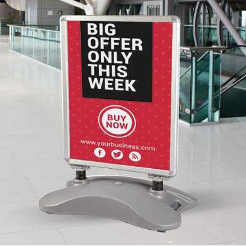 I passanti sotto la pioggia corrono in centro città e scoprono il tuo messaggio pubblicitario sul cavalletto: caffè caldo! I clienti si precipitano nel tuo locale grazie a questo cavalletto resistente alle intemperie. A proposito, non funziona solo per i bar. Ristoranti, parrucchieri, rivenditori, boutique e chiunque desideri trasformare i passanti in nuovi clienti può utilizzare questi cavalletti outdoor.