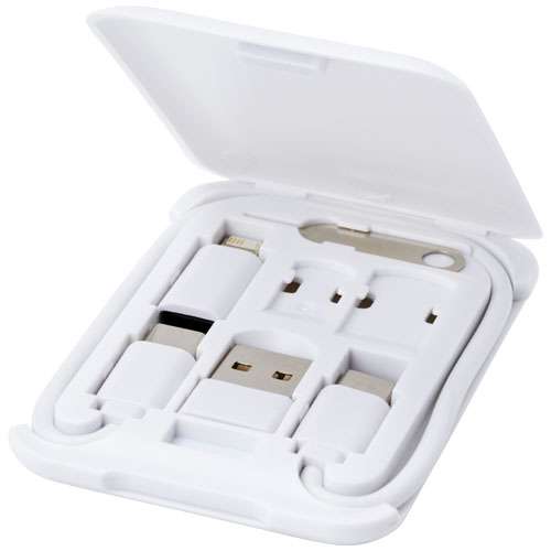 Cavo modulare per il trasferimento dei dati e la ricarica, realizzato in plastica riciclata e fornito all'interno di un'elegante confezione che funge anche da supporto per telefono. Il cavo offre diverse soluzioni di ricarica: ingresso Tipo-C e USB-A e uscita Tipe-C/iOS/micro USB. Grazie a tutti questi adattatori e connettori, questo cavo consente di caricare la maggior parte degli smartphone, delle fotocamere, dei power bank, degli auricolari, ecc. Il cavo ha una potenza massima di uscita di 2 A. Dispone di un pin di espulsione che si rivela utile ogni volta che è necessario estrarre la scheda SIM del telefono. Il contenitore presenta anche uno spazio per conservare una scheda di memoria micro SD e una scheda nano SIM, rendendolo un accessorio perfetto per i viaggi. Lunghezza del cavo: 26 cm. Fornito in una busta di carta kraft riciclata al 100%.