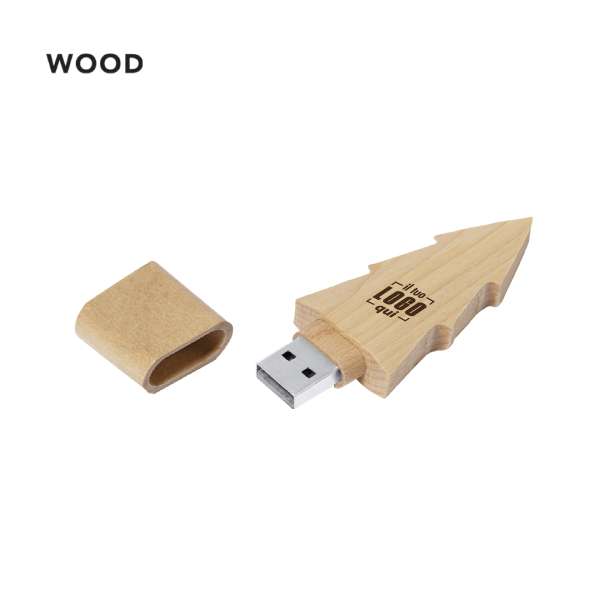 Chiavetta USB 16GB in legno morbido con design a pino e chiusura a cappuccio. Sostenibile ed elegante, è un gadget utile per lavoro, scuola o come regalo eco-friendly.