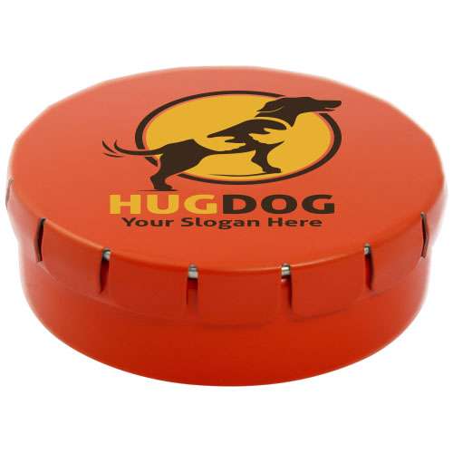 Cioccolatini in contenitore di latta con facile apertura a scatto. Il contenitore può essere ordinato in una vasta gamma di colori e riempito con caramelle dai gusti diversi: mentine tradizionali, mentine extra forti, mentine senza zucchero, gelatine di frutta, caramelle a forma di cuore e al gusto fragola, cannella, caramelle al limone e menta o cioccolatini. Il coperchio può essere decorato con una stampa digitale a colori.