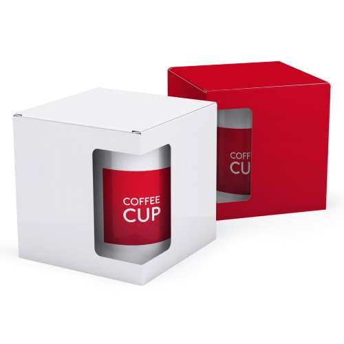 Scatole personalizzate per tazze con finestra. Stampa su tutta la superficie in CMYK. Eleganti e robuste, ideali per eventi, regali e fiere. Da 1 pezzo.