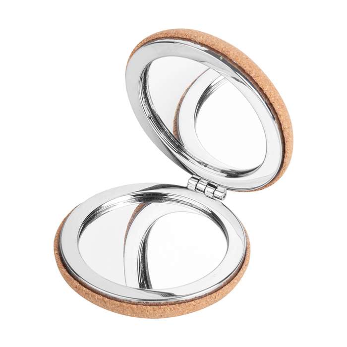 Specchietto da borsa di forma circolare in sughero del diametro di 6 cm personalizzato di ottima qualità con due ingrandimenti