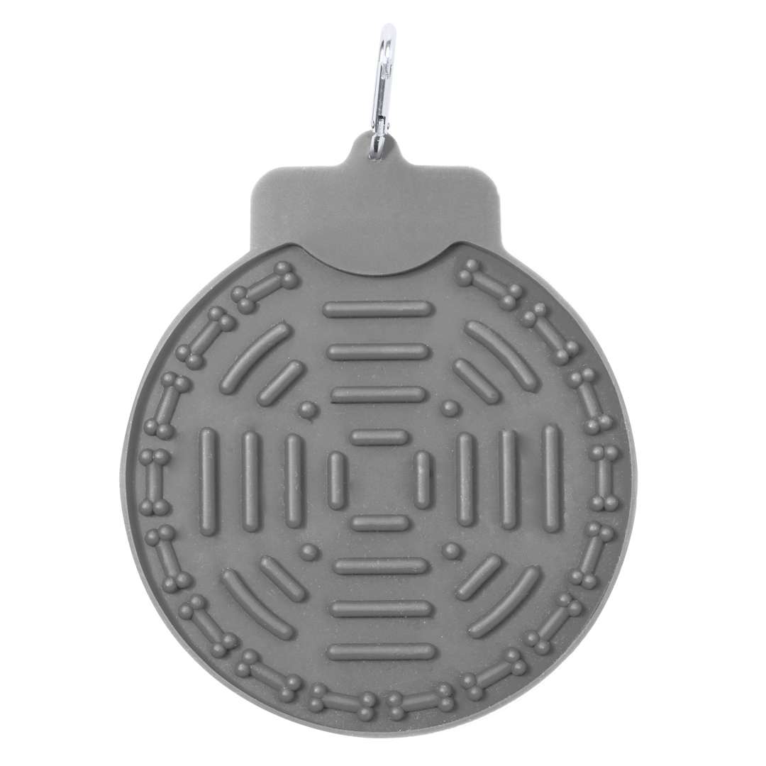 Tappetino per la pulitura della lingua per animali domestici in morbido silicone. Con potenti ventose per il fissaggio alle superfici piane, in modo che gli animali domestici possano leccare la superficie ruvida. Moschettone incorporato per un facile fissaggio. Presentato in un sacchetto individuale riciclato.