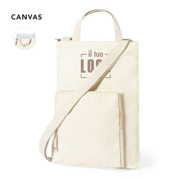Originale custodia per computer portatile, realizzata in tela resistente con finitura naturale. Scomparto principale con chiusura a zip e maniglia per il trasporto. Con tracolla regolabile abbinata e tasca esterna con cerniera. Adatto a laptop o tablet fino a 15".