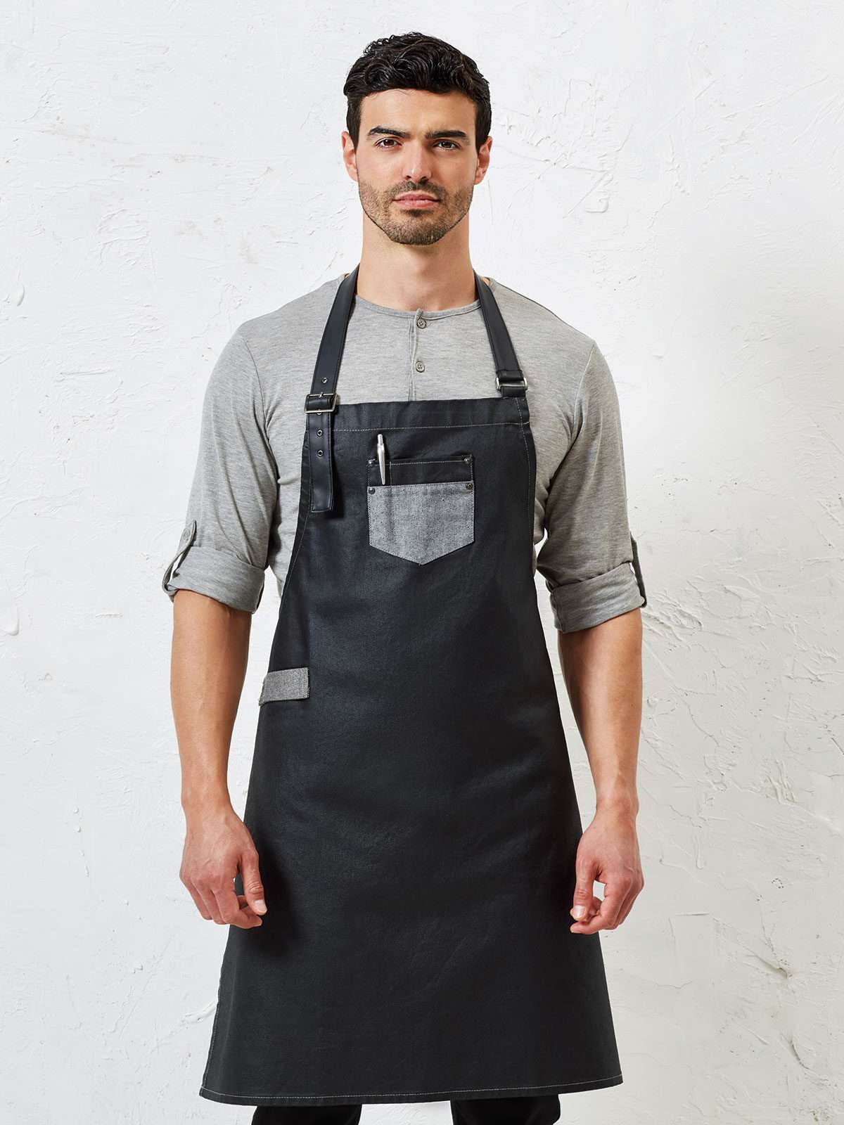 100% Cotone Denim Twill con rivestimento acrilico. Grembiule con finitura in acrilico. Laccio in vita in finta pelle lungo 1m e laccio al collo regolabile con fibbie metalliche. Cuciture e tessuto in jeans a contrasto, tasca di grandi dimensioni applicata e tasca di servizio, Lavabile a 60°C.