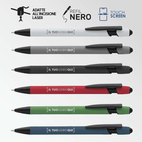 Penna a sfera con meccanismo a scatto e raffinato fusto in metallo con rivestimento soft touch per una presa confortevole. Dotata di gommino touch screen integrato e minuterie nere in metallo per un look moderno e professionale. Ideale per gadget aziendali di alta qualità.