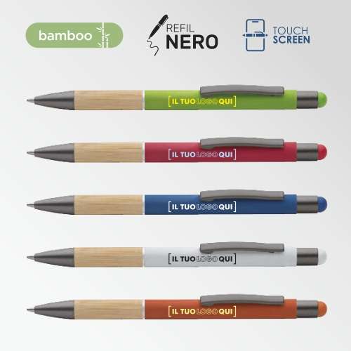 Eleganza e sostenibilità si incontrano in questa penna a sfera con gommino per touch screen. Il fusto in metallo con doppia rifinitura gommata e bamboo naturale regala una sensazione premium al tatto, mentre le minuterie in metallo valorizzano il design. Pratica grazie al meccanismo a scatto e ideale per personalizzazioni aziendali.