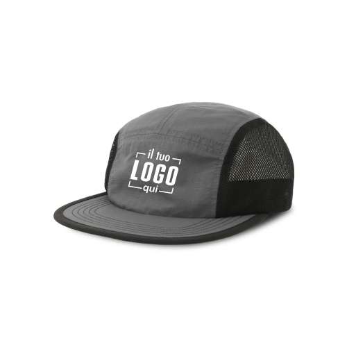 100% nylon ricilato - lati e retro: poliestere riciclato. Cappello a 5 pannelli, impermeabile, ideale per lo sport con parasudore dry-tech, visiera piatta e pieghevole, chiusura con fibbia ad incastro, pannello frontale stampabile, posteriore e laterali mesh.